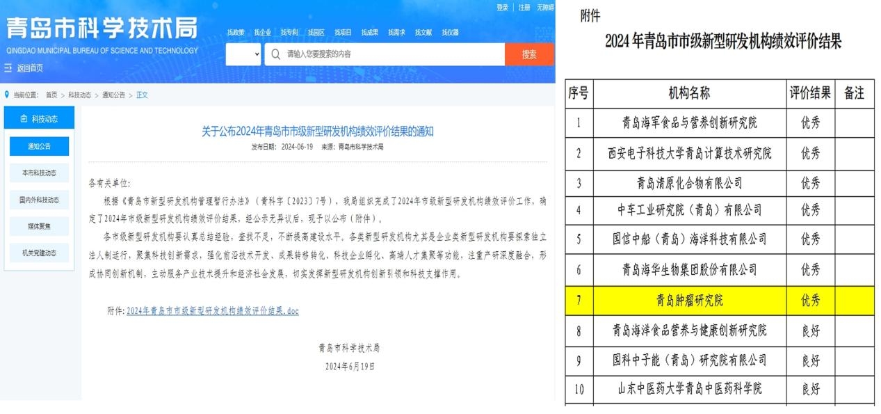 新聞網訊 日前,青島市科學技術局正式發布2024年度青島市新型研發機構績效評價,我校青島腫瘤研究院獲評優秀成績。