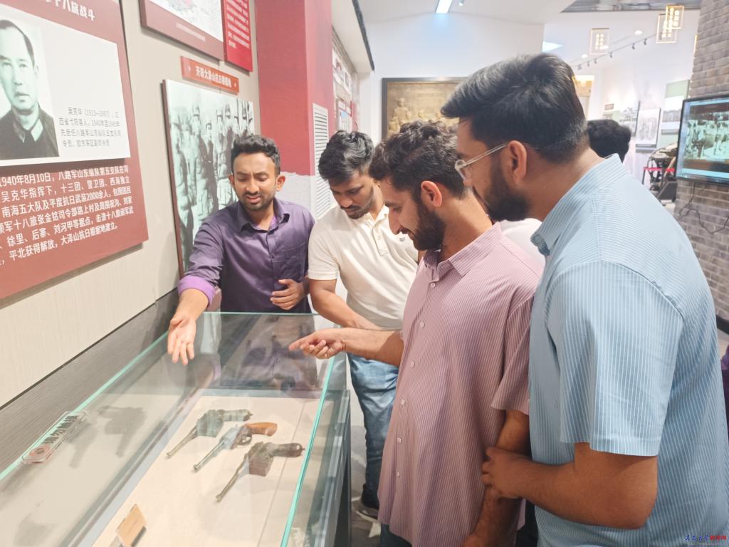 在平度市黨史館,在講解員的講解引領下留學生們依次參觀了山河破碎、黎明之光、開天辟地、激流勇進、浴血榮光、銅墻鐵壁、人間正道、換了人間、戰天斗地、改革開放、砥礪前行11個部分,一個個生動的故事、一張張泛黃的珍貴圖片、一件件具有歷史痕跡的寶貴文物,將平度市黨組織在革命、建設和改革各個歷史時期所走過的光輝歷程、發生的滄桑巨變和取得的偉大成就,全景展示了以楊明齋、劉謙初為代表的平度兒女英勇斗爭、頑強奮斗的英勇事跡。
