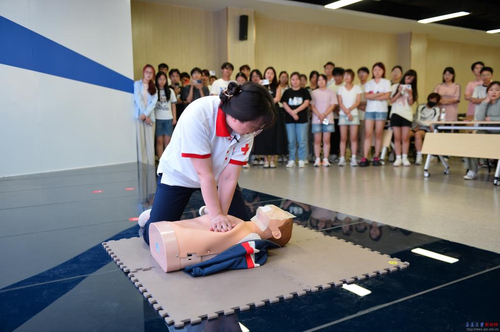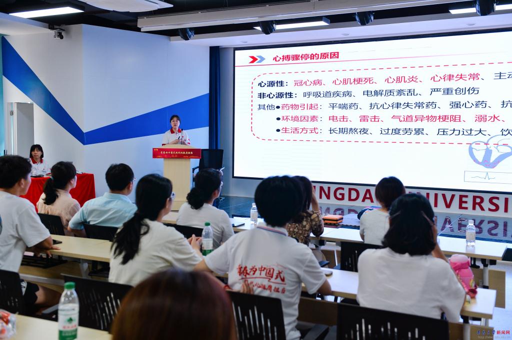 出征儀式結束后分別進行了全國優秀實踐團隊經驗分享、安全知識講座和急救培訓。我校醫學部護理學院韓晶老師受邀帶領團隊開展了紅十字心肺復蘇+AED培訓。專題培訓同步進行線上直播,觀看人數超過4000人次。