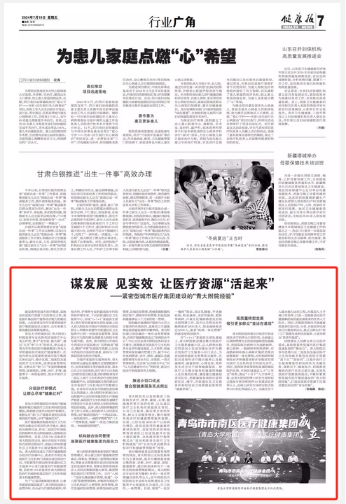 新聞網(wǎng)訊 7月19日,《健康報》刊登題為《謀發(fā)展 見實(shí)效 讓醫(yī)療資源“活起來”--緊密型城市醫(yī)療集團(tuán)建設(shè)的“青大附院經(jīng)驗”》的文章。