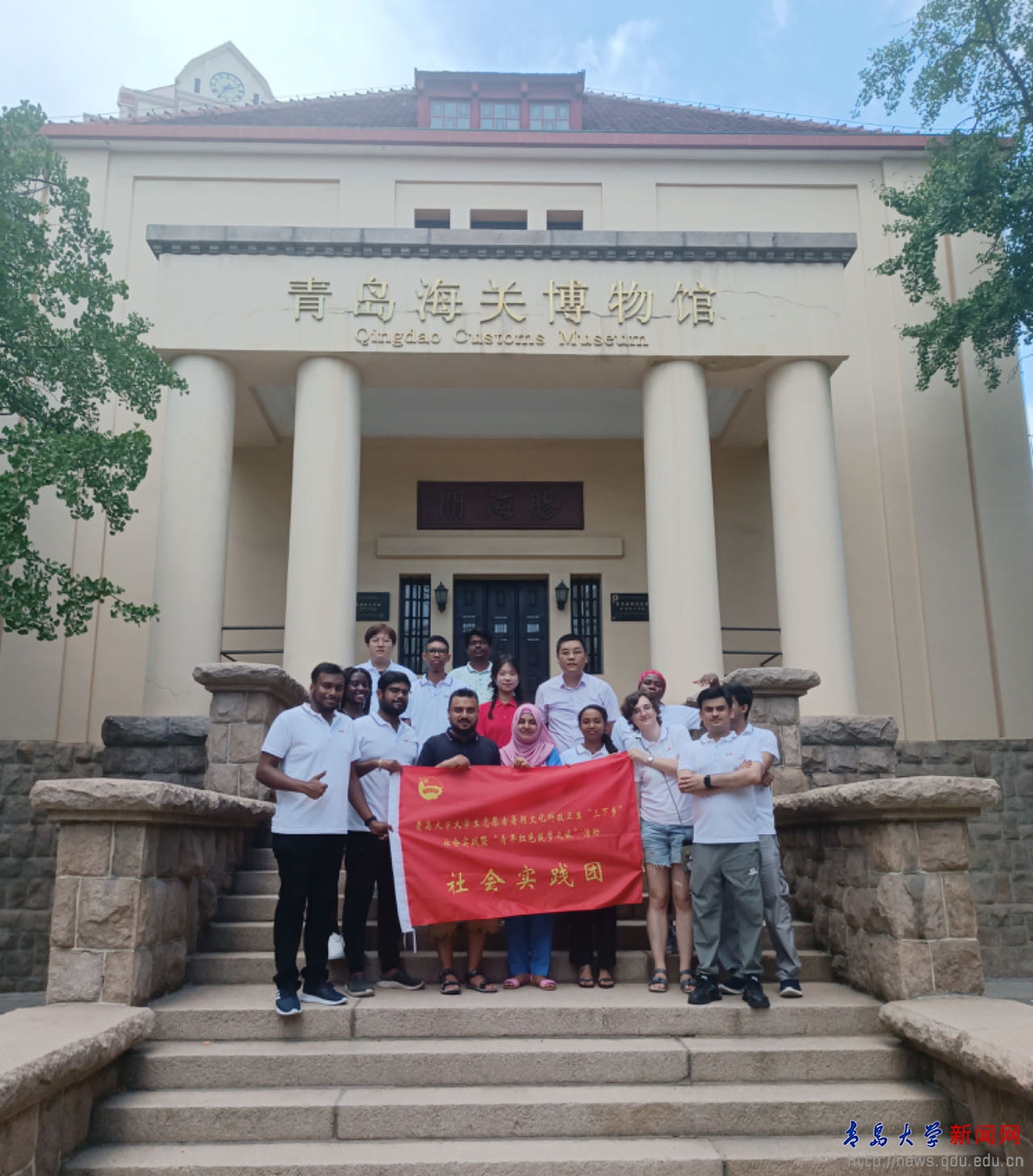 實(shí)踐團(tuán)隊(duì)成員們還參觀了位于市北區(qū)新疆路的青島海關(guān)博物館,在海關(guān)博物館講解員的熱情帶領(lǐng)下,追隨著"海關(guān)"百年以來(lái)的歷史演變,親身感受了青島海關(guān)的悠久歷史,仿佛置身于歷史的長(zhǎng)河之中。一件件珍貴文物、一幅幅歷史圖片、一段段歷史記憶引人入勝,在參觀中,中外大學(xué)生們?cè)敿?xì)了解了青島從小漁村到北方著名通商口岸的歷史蛻變,了解了青島海關(guān)發(fā)展的歷史,探尋了一代代青島海關(guān)人順應(yīng)時(shí)代洪流,與山東省、青島市“以港興省、以港興市”發(fā)展戰(zhàn)略和對(duì)外開(kāi)放過(guò)程同頻共振的歷史沿革,體會(huì)到海關(guān)在地方開(kāi)放發(fā)展中的作用。據(jù)悉青島海關(guān)博物館位于膠海關(guān)舊址內(nèi)。膠海關(guān)是青島海關(guān)的前身,設(shè)立于1899年7月,是近代中國(guó)第一個(gè)租借地海關(guān)。青島海關(guān)博物館共設(shè)立“膠海關(guān)專題”、“山東地區(qū)海關(guān)歷史”兩部分基本陳列內(nèi)容,展陳圖片千余幅、實(shí)物近500件、多媒體資料片12部、場(chǎng)景復(fù)原2處。