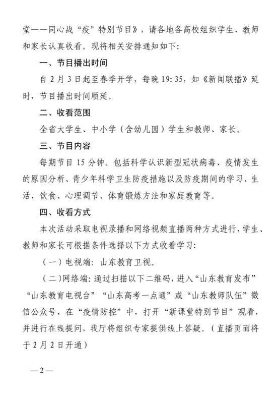 根據(jù)《省委辦公廳省政府辦公廳關(guān)于進(jìn)一步加強(qiáng)新型冠狀病毒感染的肺炎疫情防控工作的通知》精神和《山東省教育廳新型冠狀病毒感染的肺炎疫情防控工作小組關(guān)于組織收看疫情防控特別節(jié)目的通知》(魯教疫控組字[2020]5號(hào))要求,為加強(qiáng)衛(wèi)生健康教育,引導(dǎo)廣大師生、家長(zhǎng)提高健康素養(yǎng),養(yǎng)成良好生活習(xí)慣,堅(jiān)決打贏疫情防控阻擊戰(zhàn),山東省教育廳委托山東教育電視臺(tái)策劃制作了《新課堂--同心戰(zhàn)“疫”特別節(jié)目》,請(qǐng)各學(xué)院(部)組織學(xué)生、學(xué)工人員和家長(zhǎng)認(rèn)真收看。現(xiàn)將相關(guān)安排通知如下:
