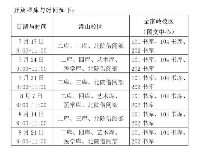 本科生所借圖書可延期至2019年9月21日之前還回(教工和研究生讀者除外)。暑期期間,中心校區圖書館、金家嶺校區圖文中心自習室正常開放,開放時間:早7:00——晚22:00。